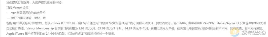此外值得注意的是,在产品描述中,Vamor展示了自己的订阅营收模式,用户可以通过订阅Vamor会员来获取更好的聊天体验,以及获得VIP徽章来显示身份。根据官方信息,Vamor Membership 目前的订阅价格为9.99 美元/月、27.99 美元/3个月、54.99 美元/6个月。