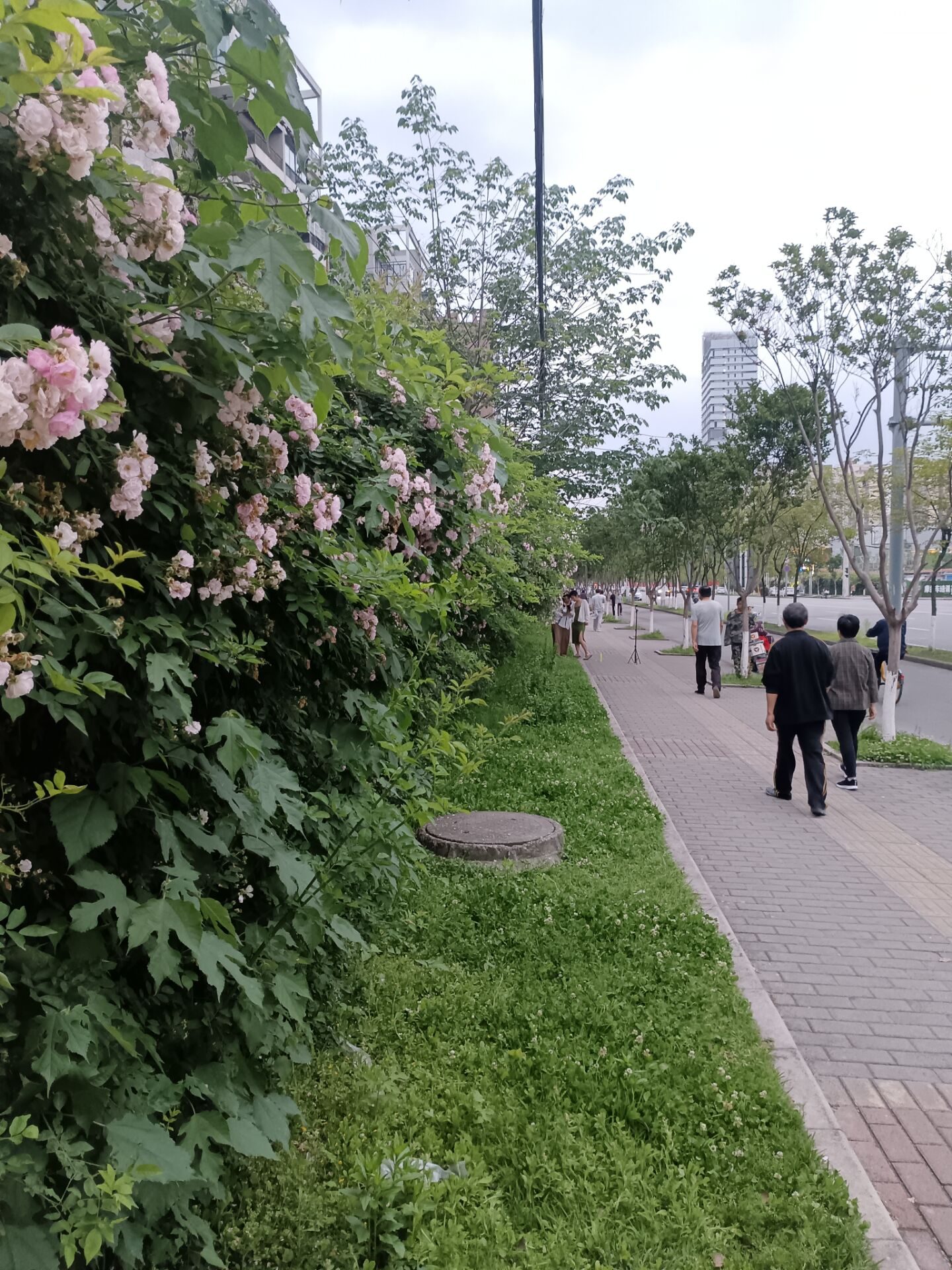 夜色中,我漫步在小区外的小道上,路过一片铺满围墙的玫瑰花海。那粉红色的花朵在月光下闪烁着淡淡的光辉,宛如一团团燃烧的火焰,照亮了周围的一切。我不禁停下脚步,拿出手机,拍下这美丽的瞬间。