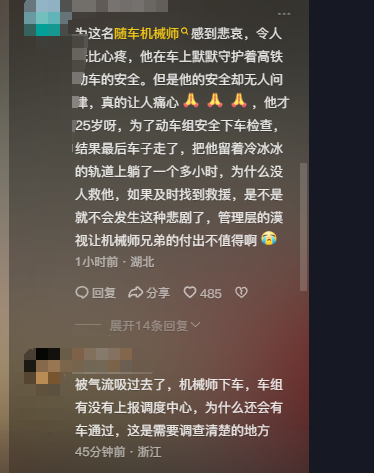 更让人心痛的是,D5515次的随车机械师在排查故障的时候,被旁边经过的列车撞倒了,抢救无效牺牲了。哎,真是太可惜了!