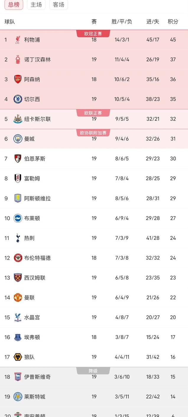 北京时间12月31日,2024-2025赛季英超联赛展开了第19轮的多场对决。客场作战的切尔西在占据场上主动的情况下,被伊普斯维奇两度利用反击破门,最终吞下失败的苦果。曼联在主场完败于纽卡斯尔联脚下,阿斯顿维拉主场战平布莱顿,积分榜也发生巨大变化。