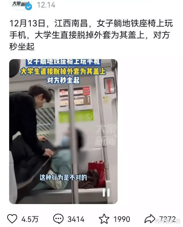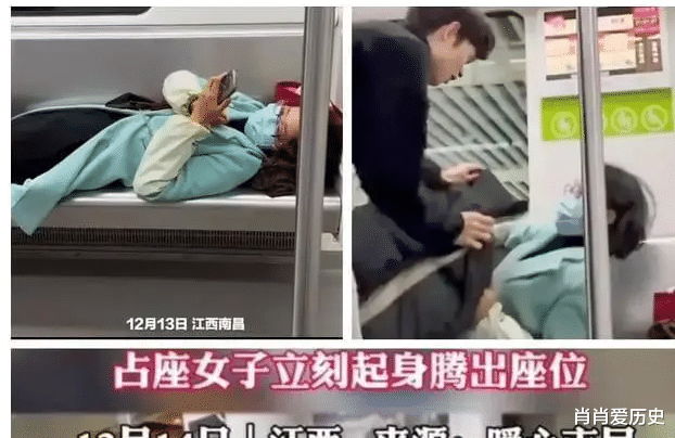 这也不是没有可能吧!就像最近看到的一个画面:一位女子自顾自把地铁椅子当成了自家床床,整个人都全然躺了下来睡了下来,然后有一位大学生看见了,他灵机一动,立马将自己的袄子脱了下来,盖在女子身上……女子一惊,一骨碌就坐了起来,连连说,啊,不用,不用!并立刻起身秒腾出了座位!