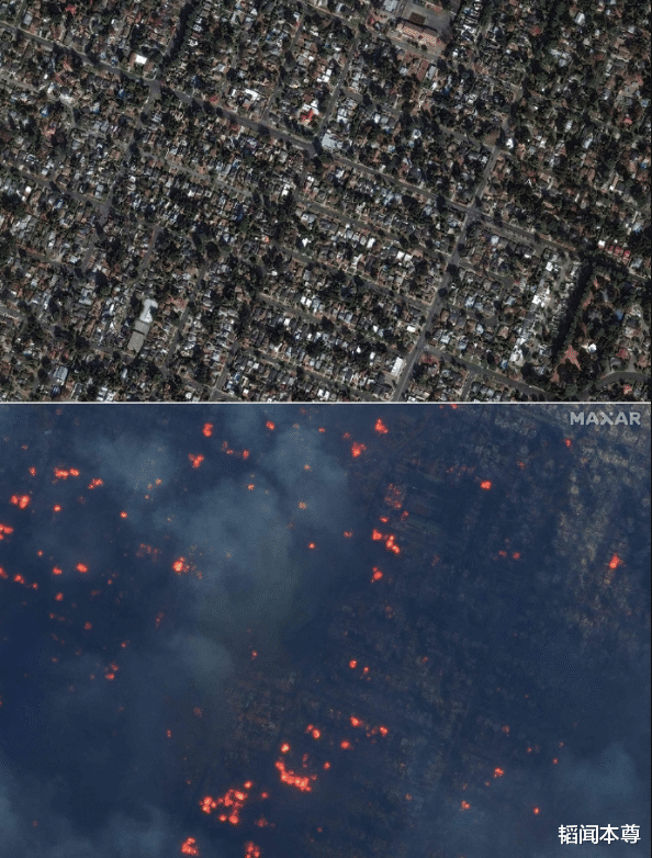 而如果从卫星照片上,则更能感受到这场山火的摧毁性。