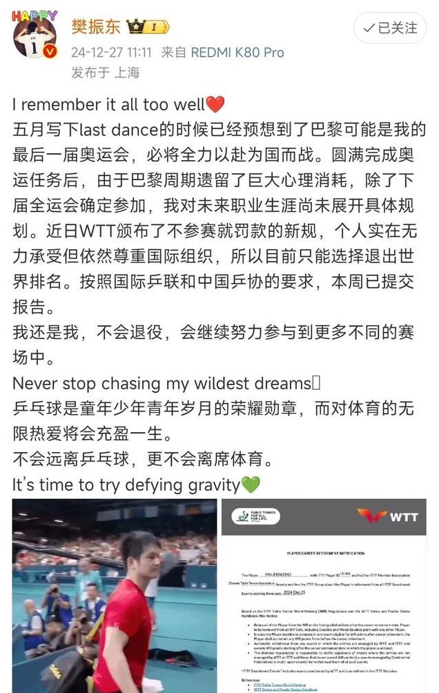 他还表示WTT颁布的不参赛就罚款的新规,他个人实在无力承受但依然尊重国际组织,所以目前只能选择退出世界排名。这样的新规无形中就迫使像他一样的运动员只能作出两种选择;一种是带着伤病和疲惫参赛,一种是退赛受罚或者退出排名。也就有点无可奈何的感觉了,现在排名第六的他在8个积分赛事里有个被赋予0分,如果再不参赛还要面临罚款,这是无法接受的,也是最终压垮他的一根稻草。
