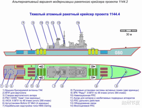 其次,“纳希莫夫海军上将”号在加强对海/对地打击能力的同时,也没有忘记增强自己的防御能力。根据相关资料显示,俄罗斯保留了原有的96单元“里夫M”垂直导弹发射系统,但是所发射的弹药从之前的48N6E系列远程防空导弹,升级为最新型的48N6DM系列防空导弹。同时,“纳希莫夫海军上将”号还将增添14联装的3K96“鲁道特”垂直发射系统,有人说是加装12组垂发系统,也有资料显示是2组垂发系统。但是由于“鲁道特”系统拥有了一坑多弹的发射能力,所以如果使用的弹药9M100导弹,则将最多拥有近200枚近程防空导弹。当然,如果再混编9M96E和9M96E2两种导弹时,拿就无法确认“纳希莫夫海军上将”号到底撞了多少枚导弹。
