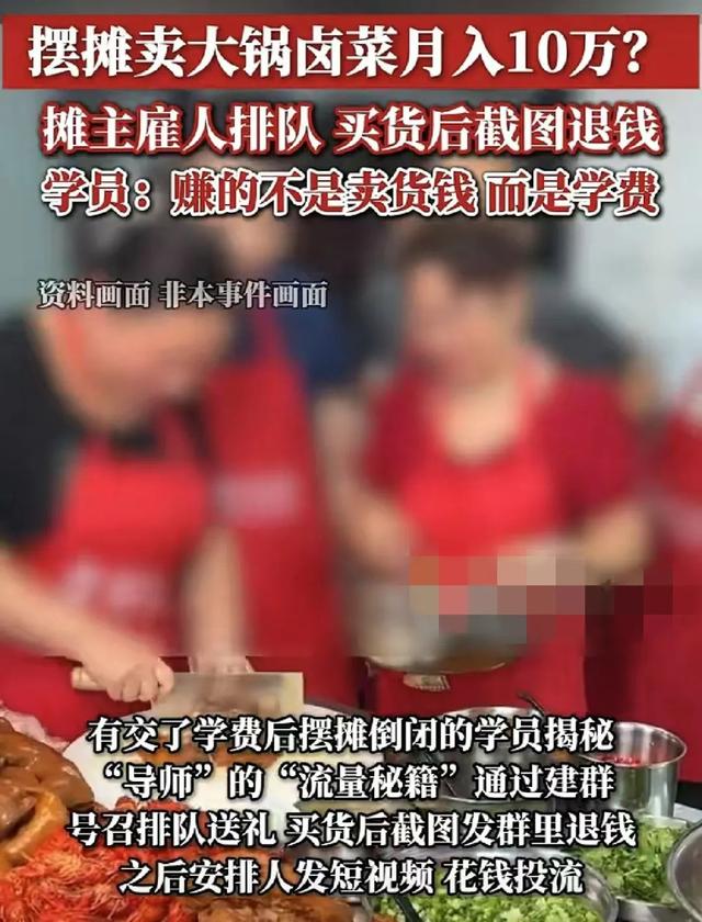 摆个小摊一年挣几十万,可以迅速发家致富。这的确很令人心动。可殊不知很多“摆摊收徒”就是披着创业培训外衣的营销套路。许多博主通过夸大收益、营造热销假象吸引学员,甚至雇佣他人排队造势,制造虚假繁荣的场景。这种模式不仅误导了学员,还涉嫌虚假宣传和欺诈。
