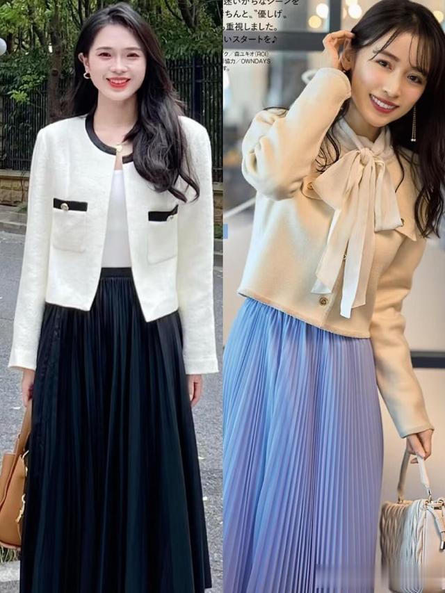 小香风的氛围是偏向于精致的,因此百褶裙的褶皱一定要明显,最好褶皱偏细长,这样上身之后才不会让裙子显得过于蓬松臃肿。