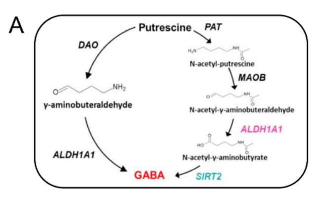 具体来说,ALDH1A1部分参与了MAOB之后的中间步骤,即将N-乙酰-γ-氨基丁醛氧化成N-乙酰-GABA,而SIRT2则是主要参与最后一步,将N-乙酰GABA去乙酰化,最终生成GABA。
