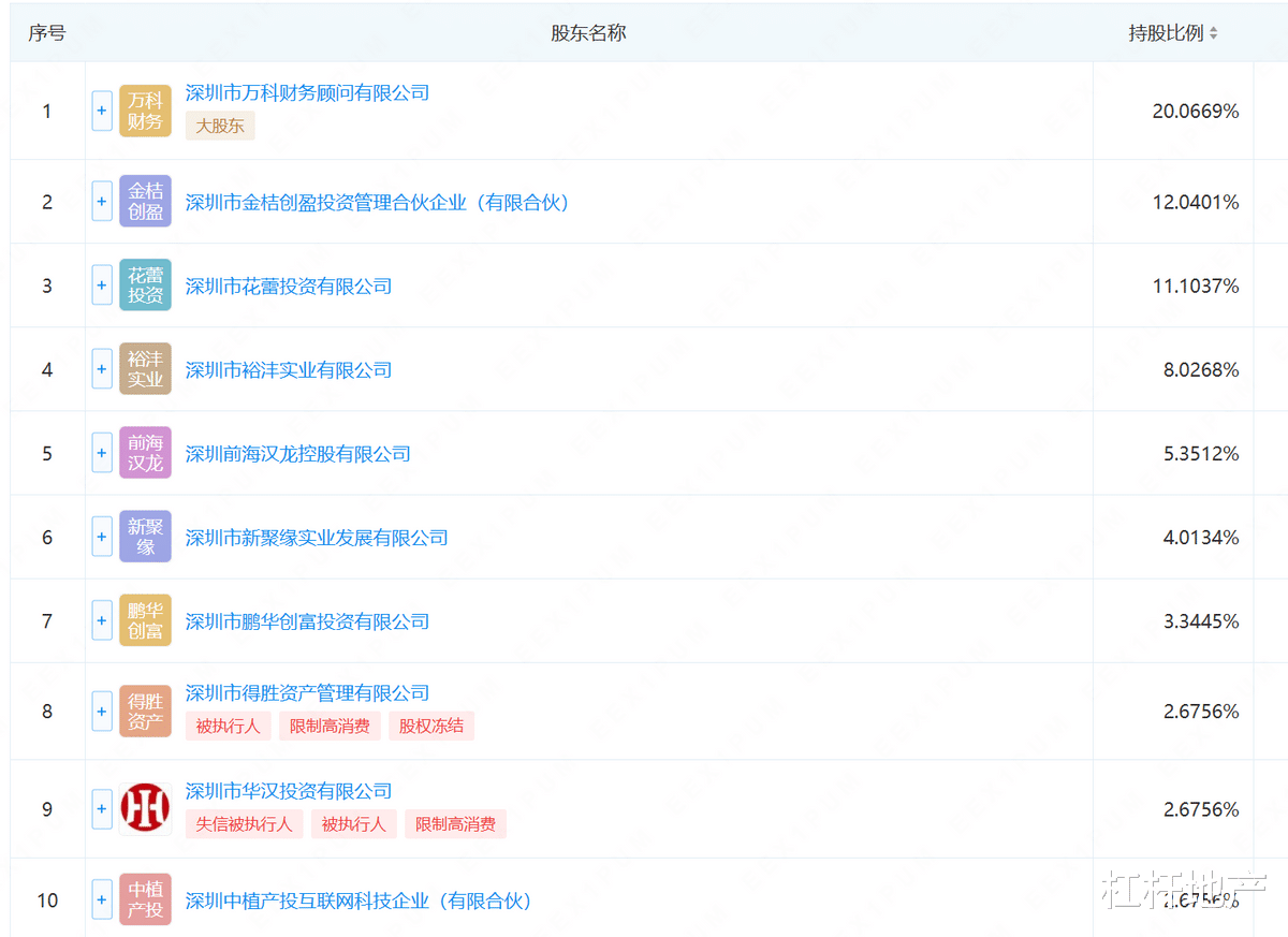 企查查里则显示该司的第一大股东为深圳万科财务顾问有限公司,持股比例20.07%。比第二大股东12.04%的持股比例高出不少。