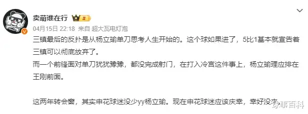 中超媒体人“卖萌谁在行”便在社交媒体上写道:“三镇最后的反扑是从杨立瑜单刀思考人生开始的。这个球如果进了,5比1基本就宣告着三镇可以彻底放弃了。而一个前锋面对单刀犹犹豫豫,都没完成射门,在打入冷宫这件事上,杨立瑜理应排在王刚前面。”
