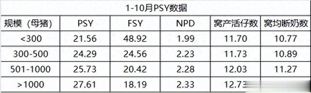 2024年1到10月份中国PSY数据已经出炉了,数据来源为数聚专嘉平台,从这一份数据里面我们能够很清晰的看出来,300头母猪以下的猪场,数据是在持续恶化的,PSY下降明显。而300到500规模,500到1000规模,以及1000以上规模,都是在稳步上升的。上升的速度我也给大家截取出来,全网估计是猪哥靓第一个解读这个数据的。
