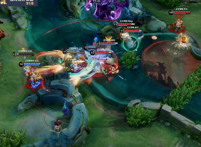 前期RW侠是崩盘的,开局杨玉环送一血,节奏断层,下路射手被压制,花云戈娅的经济和辅助装中路几乎相等,这还怎么玩?之后还被公孙离单杀在自家的野区,眼看着RW侠要废废,结果一波节奏打了回来。