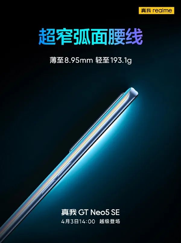 今天,realme正式官宣真我GT Neo5 SE将于4月3日发布。slogan 为“满血玩家,时刻高能”,宣称拥有火力全开的越级性能,以及颠覆体验的全新黑科技。同时,官方还公布了新机的外观。