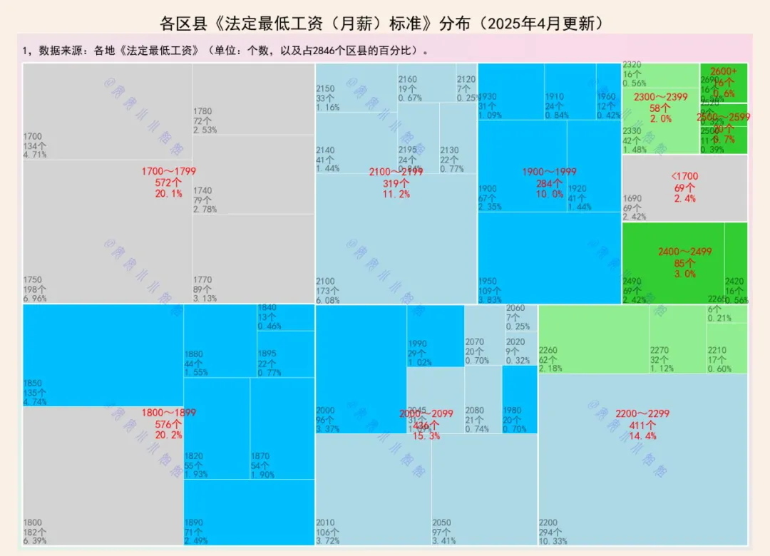 按照法定工资标准的说法,法定最低工资标准制定的初衷,是保障劳动者个人及其家庭成员的基本生活。试想一下,在北上广深这样的城市,一家三口,妻子带小孩不能上班,丈夫一个人月收入2520元(2025年3月调整后的标准),养活一家人。稍有生活常识的人都应该知道,这样的日子,在这样的地方,过得还是相当艰难的。为了让一家三口的日子过得更好一些,尽可能提高家庭的收入水平,这位丈夫通常只有两种选择:掌握并从事一门收入更高的劳动技能,或者延长自己的工作时间。很多类型的宏观数据表明,跟提高自己的劳动技能相比,延长工作时间是适用范围更广、也更容易实现的方法。引用某地的传世名言:一天打三份工,日子越来越有盼头。或者,我们将其修改一下,一天工作24个小时,日子越来越有盼头。写到这里,你一定会发现作者想表达的意义,法定最低工资标准,其实已经偏离了制定的初衷。即:当前的法定最低工资标准,已经无法保障劳动者个人及其家庭成员的基本生活。有鉴于此,官方明确表态,2025年内,所有的省份都要调整法定最低工资标准。从社会经济转型的角度看,在同样的时间内,获得更多的劳动报酬,是社会经济正向发展的必然趋势,也是在更大范围内,实现财富在不同人群间流动的必要条件。如你所知,我们生活的社会,是一个物资极大丰富的时代,物资本身并不重要,物资流通的背后,才是真正的财富。普通人能够拿出手的,只有自己的劳动时间(大多人所谓的劳动技能根本不重要),在有限的时间内,获得更多的收入,用于消费,才能带动经济从生产向消费的转型。理想通常是丰满的,现实又是如何呢?有位喜欢胡说八道的初中毕业网友甚至说,月薪三千,在他所生活的地方,已经绝迹了(大意如此)。基于各地的法定最低工资标准,我们得到全国2800多个区县市的法定最低工资标准分布情况,如下图所示。