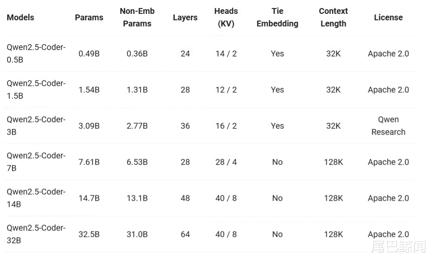 Qwen2.5-Coder 的 0.5B、1.5B、7B、14B 和 32B 模型均采用了 Apache 2.0 许可证,而 3B 模型则使用了 Research Only 许可。