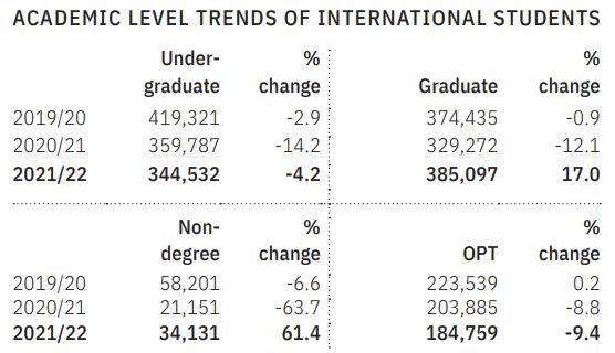 研究生变化格外喜人,2021/22学年有385,097国际学生在美读研,比上一学年增长17%,基本恢复至疫情前水平。