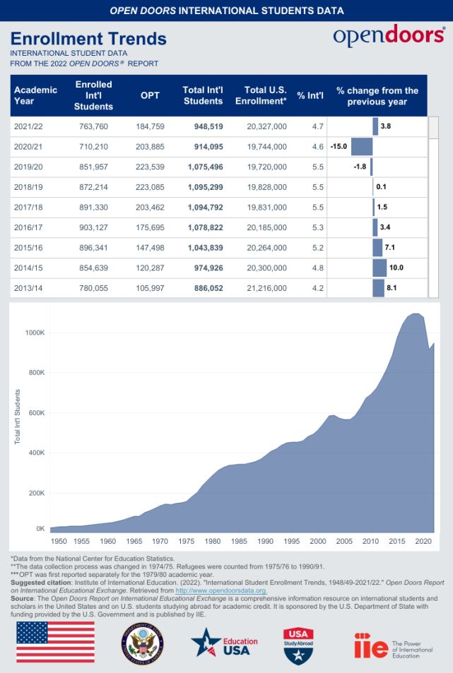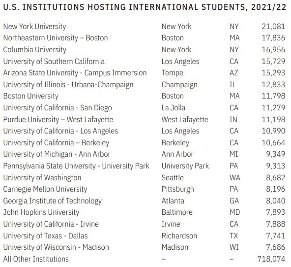 2021-2022学年,美国有国际学生948519人,比去年的914095人增长了3.8%,略有回升,但依然远低于2018、19学年。