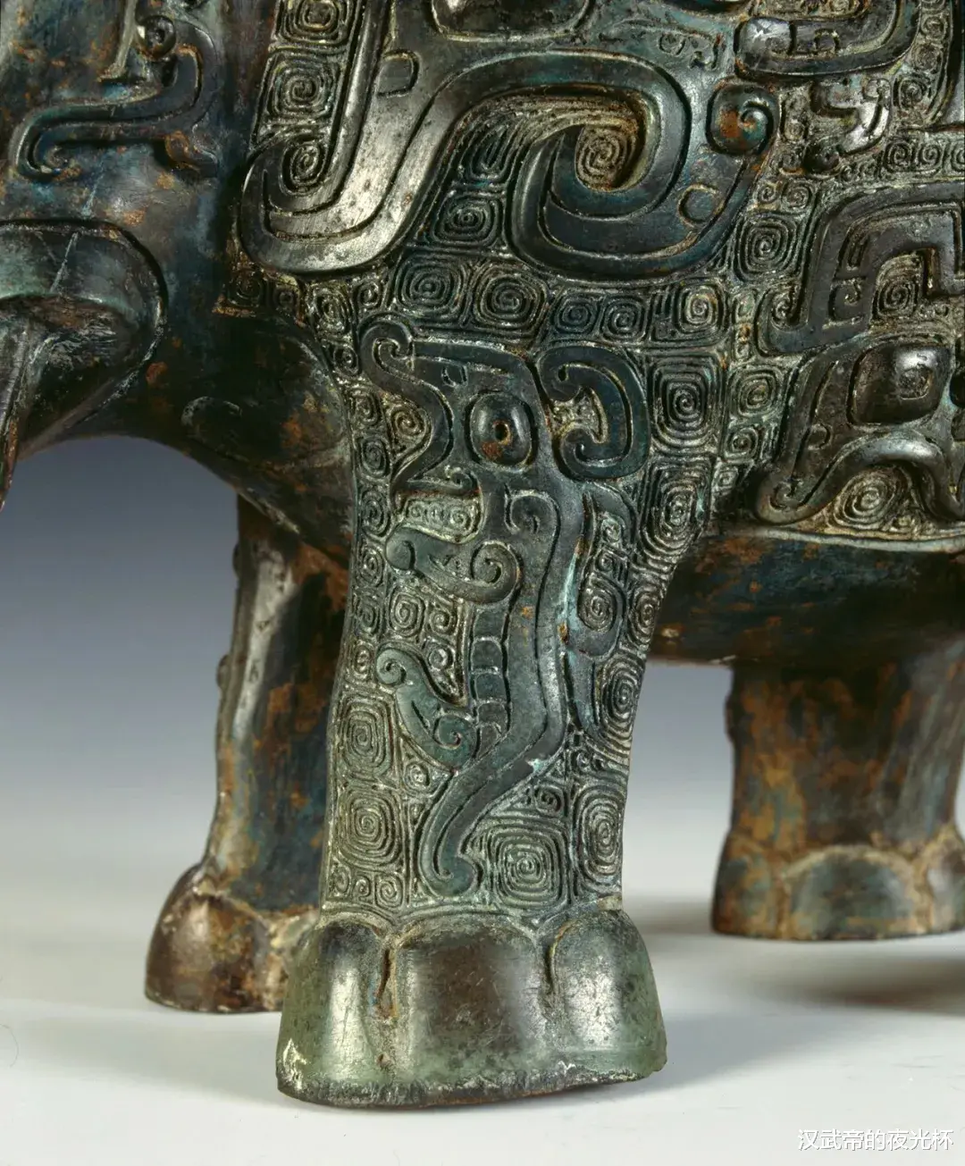 整件青铜器的纹饰做工之细腻,达到了令人叹为观止的程度。每一道线条都流畅而有力,每一个细节都经过精心雕琢,展现出古代工匠们卓越的艺术才华和精湛的工艺水平。这尊“商铜象尊”不仅是一件实用的盛酒礼器,更是一件不可多得的艺术品,它以其生动的造型、精细的铸造和丰富的文化内涵,成为了商代青铜文化的杰出代表。