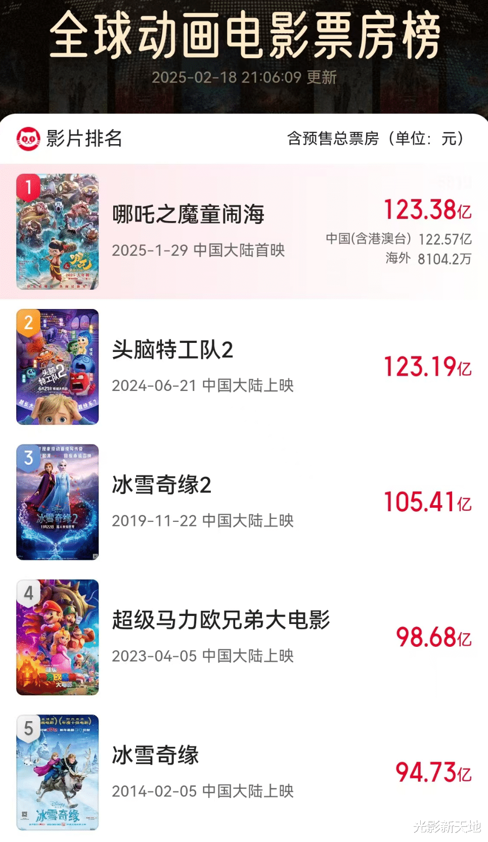 2月18日晚,上映21天的《哪吒之魔童闹海》算上海外票房超过《头脑特工队2》的123.19亿,成功登顶全球动画电影票房榜。而内地总票房预测虽然降至151亿,也是全球动画电影很难企及的高度,所以未来很长一段时间,《哪吒2》都将稳坐全球动画电影票房榜首。