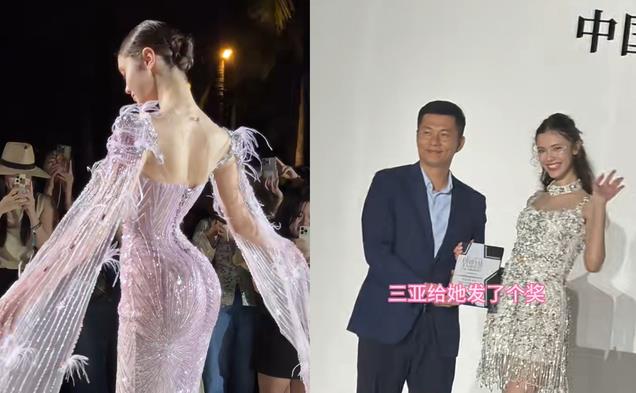 主办方直接抓紧热度为Domi颁发了一座奖杯,感谢她为三亚婚纱秀做出的突出贡献。