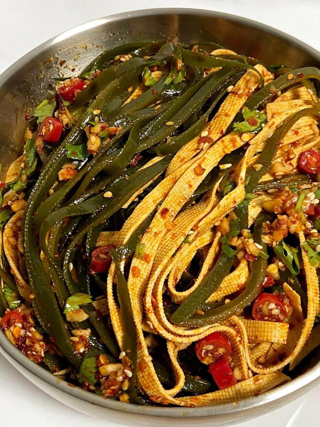 豆皮富含植物蛋白,而海带则富含碘和纤维素,二者结合不仅能滋阴润肺,还能清热解毒、祛除秋燥。这道凉拌豆皮海带清爽开胃,口感爽脆,非常适合在秋天食用。无论是做主菜还是配菜,都能让你在干燥的秋季里感到格外舒适。