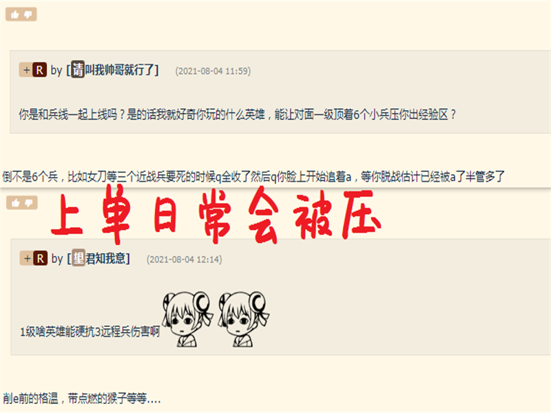 本来在召唤师峡谷中,上路就是一条十分孤儿的路,毕竟在中野眼里,下路一抓就是两个人头,还能控龙,这使得玩家们往往围绕中下作战,这就让距离最远的上路十分单机。一旦劣势了,很容易被从头压到尾,最终躺赢或躺输。这也是为什么上单一般携带tp,除了提升抗压能力,更是为了提升全局影响力。而现版本中,有非常多的上单玩家携带点燃,就是为了打出对线优势,这就使得携带tp后在对线期往往会打得十分压抑。而最压抑的,莫过于对线的还是带上点燃的刀妹、巨魔、劲夫等一级就极为强势的英雄,本来一级就对拼不过,少一个点然后一级强闻经验都有可能被单杀,一旦对手打野再进行针对,便意味着整局游戏断开连接。这也让一位上单玩家发帖询问,该如何应对上路一级被压出经验区的情况。