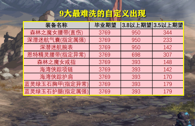 你会发现,森林之魔女腰带(直伤)、深潜迷航气囊(指定属强)、深潜迷航腕表、恩特精灵腰带(指定异常)、森林之魔女戒指、海湾侠踪项链、海湾侠踪护肩、蓝灵上衣(指定异常)和蓝灵护腿(指定属强),这9件自定义装备,4词条都洗完美,毕业期望最难,使用“扭曲次元晶体”数量最多!