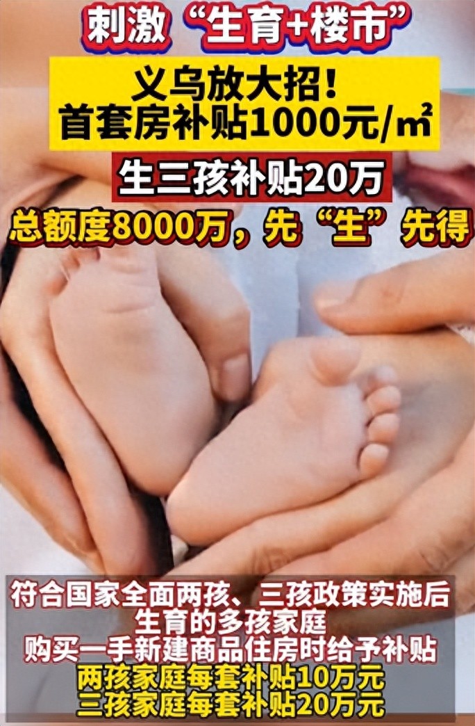 最近,浙江义乌出台了一项引发热议的生育激励政策:对生育三胎的家庭提供20万元的购房补贴,总补贴额度8000万元,采取"先到先得"的申领方式。这项政策一经公布,立即在社交媒体上引发广泛讨论。