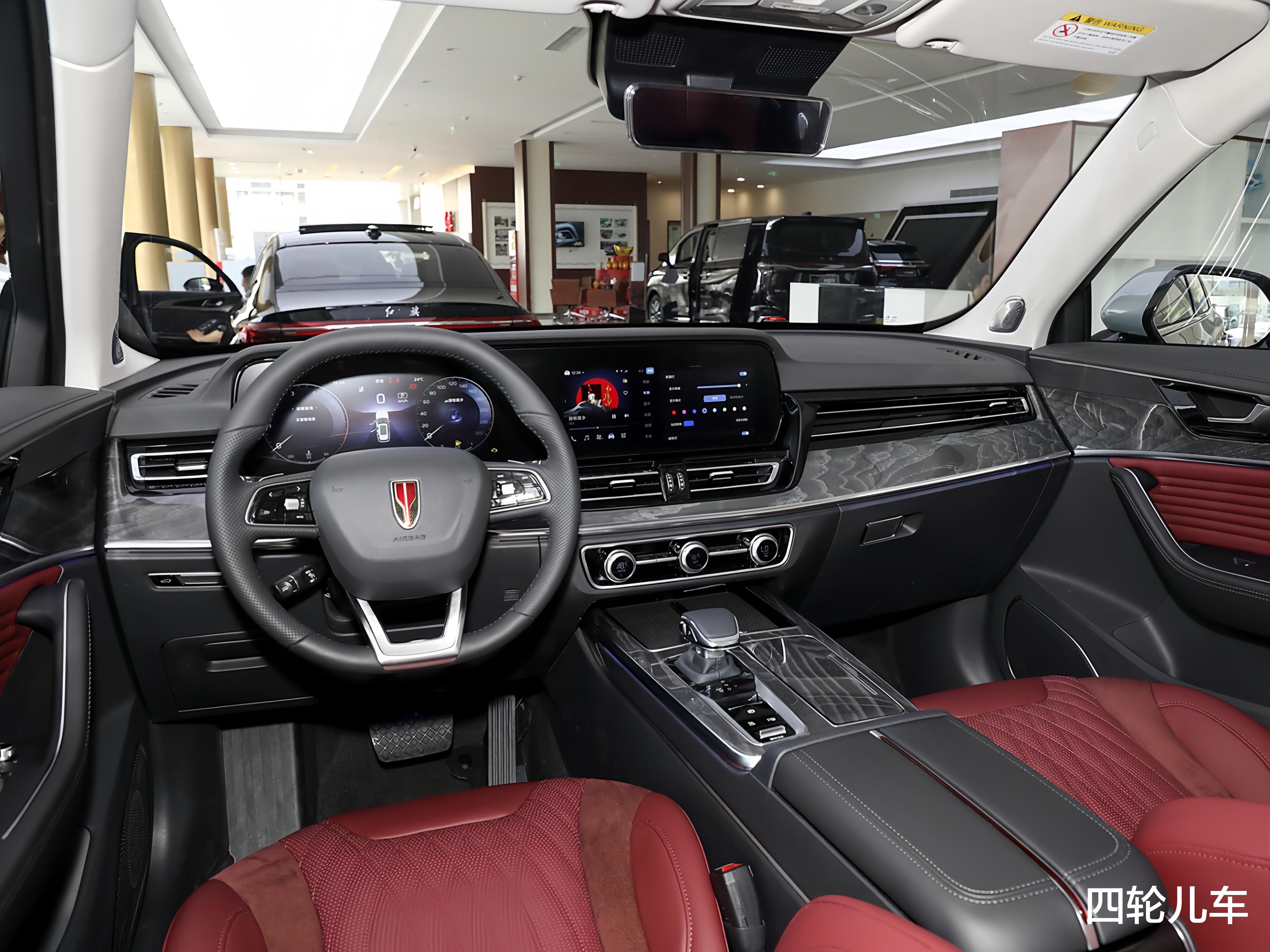 内饰设计,中控台上采用双12.3英寸液晶屏,双联屏设计把内饰科技感拉满;中控台和门板上都带有灰白色木纹板,配上红色座椅,高级感油然而生。扶手箱设计很讨巧,一根镀铬条从中间将扶手箱分开,与发动机盖上的红旗LOGO有那么一些异曲同工之妙。
