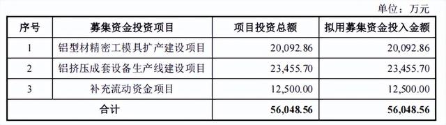 募集资金将用于:“铝型材精密工模具扩产建设项目”、“铝挤压成套设备生产线建设项目”、“补充流动资金项目”。