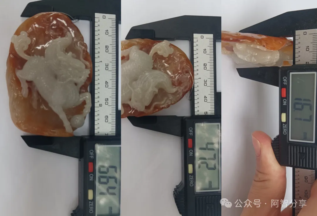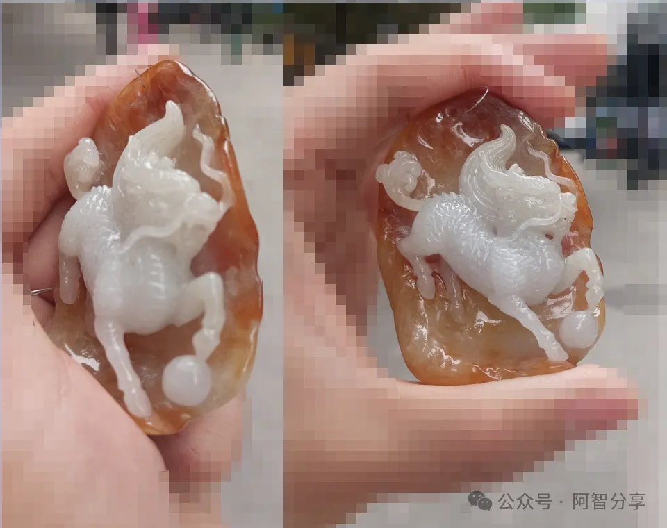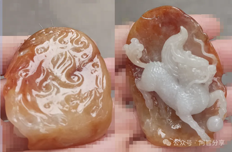雕工🐉:特色红皮俏色巧雕,最大限度的把值钱的黄翡部分留了下来。白色玉肉部分,虽然翡翠品质稍差,但通过巧雕,做成了立体的麒麟。由于麒麟遍身纹理,可以遮瑕,因此品相有所提升。整体来说,雕工是给这块材料增值了不少。