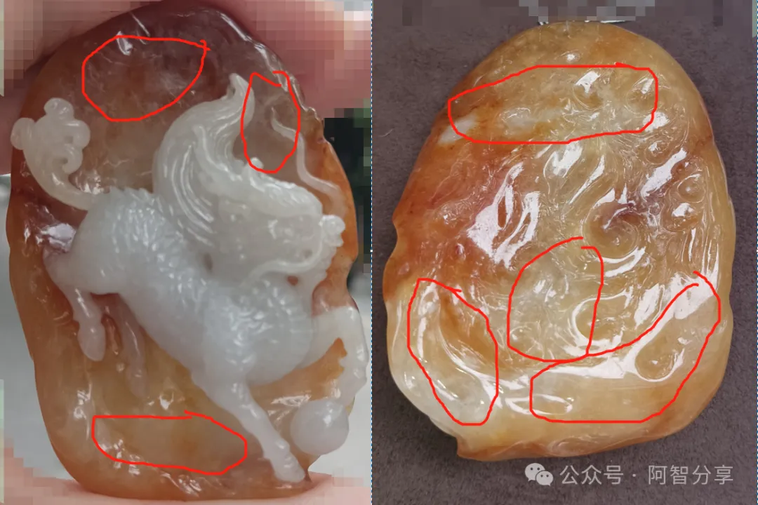 瑕疵👀:整体观察未发现明显的纹、裂、脏。白棉比较重,如上图2的牌子背面,很多白棉透过牌身,到了后面,说明黄翡厚度不足,分布不均。有些地方,局部只有薄薄的一点。