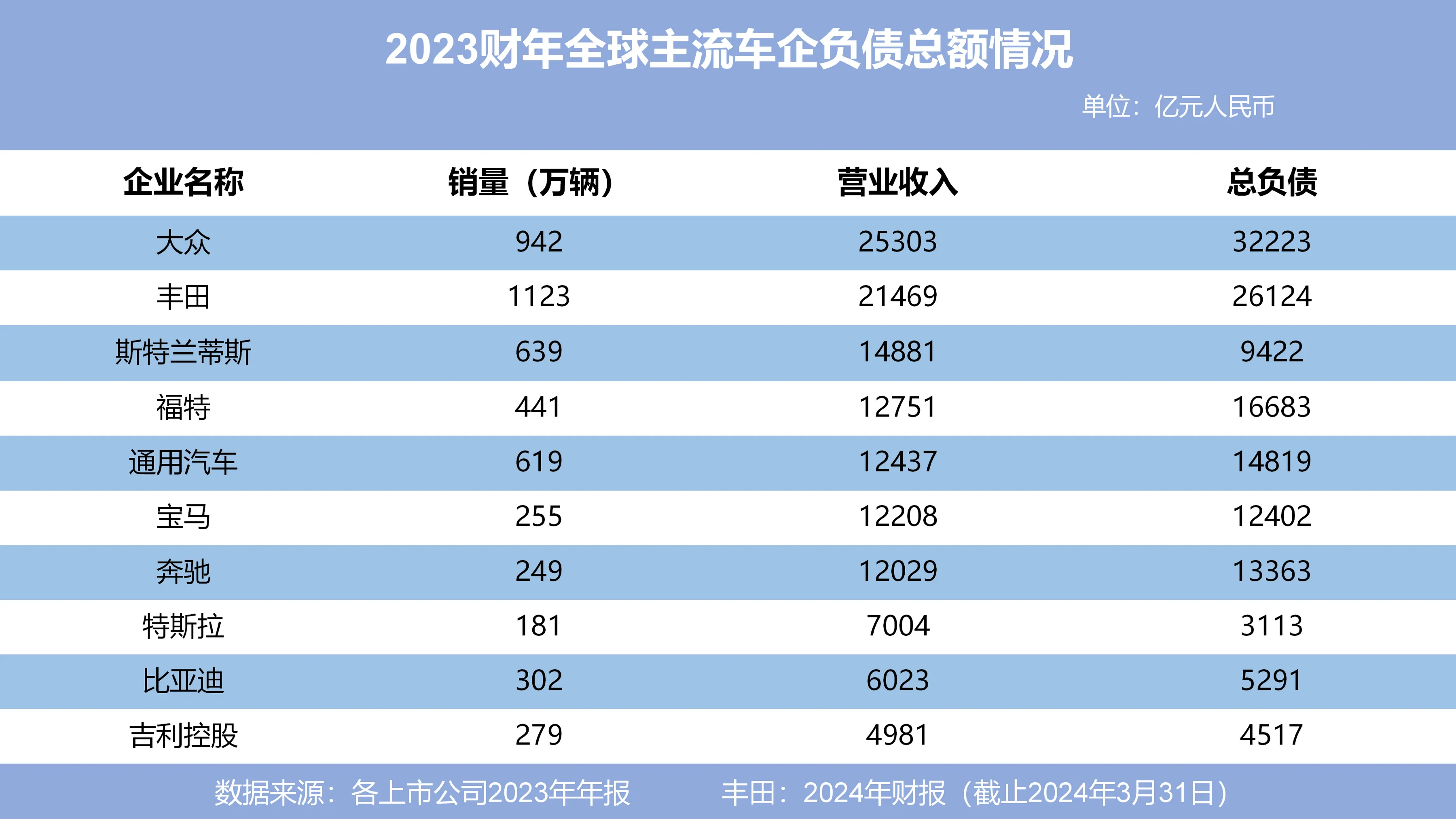 反观国内车企的总负债相对较低,2023年上汽集团营收7447亿元,总负债6637亿元,比亚迪营收6023亿元,总负债为5291亿元,吉利控股营收4981亿元,总负债为4517亿元。