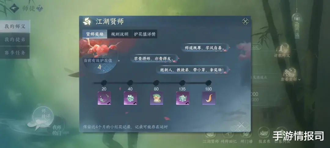 3、为了降低江湖贤师”护花值“的获取难度,我们做出以下调整: