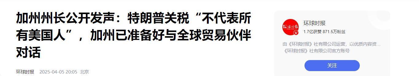 加州州长公开批评了特朗普的关税政策,明确表示这不代表全体美国人的立场。他向国际投资者喊话,强调加州将继续致力于与全球贸易伙伴保持开放和顺畅的合作关系。州长认为,加州的经济发展离不开国际贸易,因此会坚持维护与其他国家的良好贸易往来。他呼吁投资者不要因为联邦政府的关税政策而对加州失去信心,加州依然是全球贸易的重要参与者。