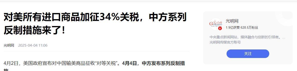 4月2日,特朗普政府突然宣布,将对我国出口至美国的产品额外征收34%的关税。然而,不到一天时间,中国迅速采取了相应的应对措施,对美国实施了反制行动。这一连串的举动显示出双方在贸易问题上的紧张关系正在加剧。中国的快速反应不仅表明了其维护自身利益的决心,也凸显了在国际贸易争端中的坚定立场。这一事件再次证明,单方面的贸易限制措施往往会引发连锁反应,导致双方关系的进一步恶化。
