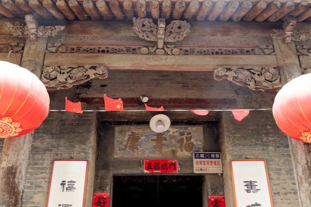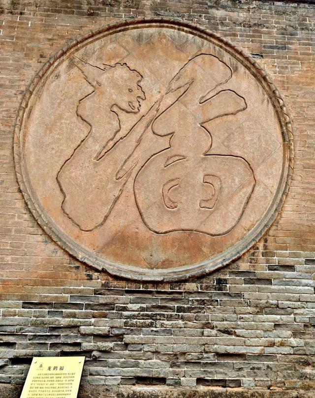 门口对面有影壁,上面的砖雕是一个福字,说是龙鹤福,左边像龙,右边像鹤,据说这种写法别无分号。