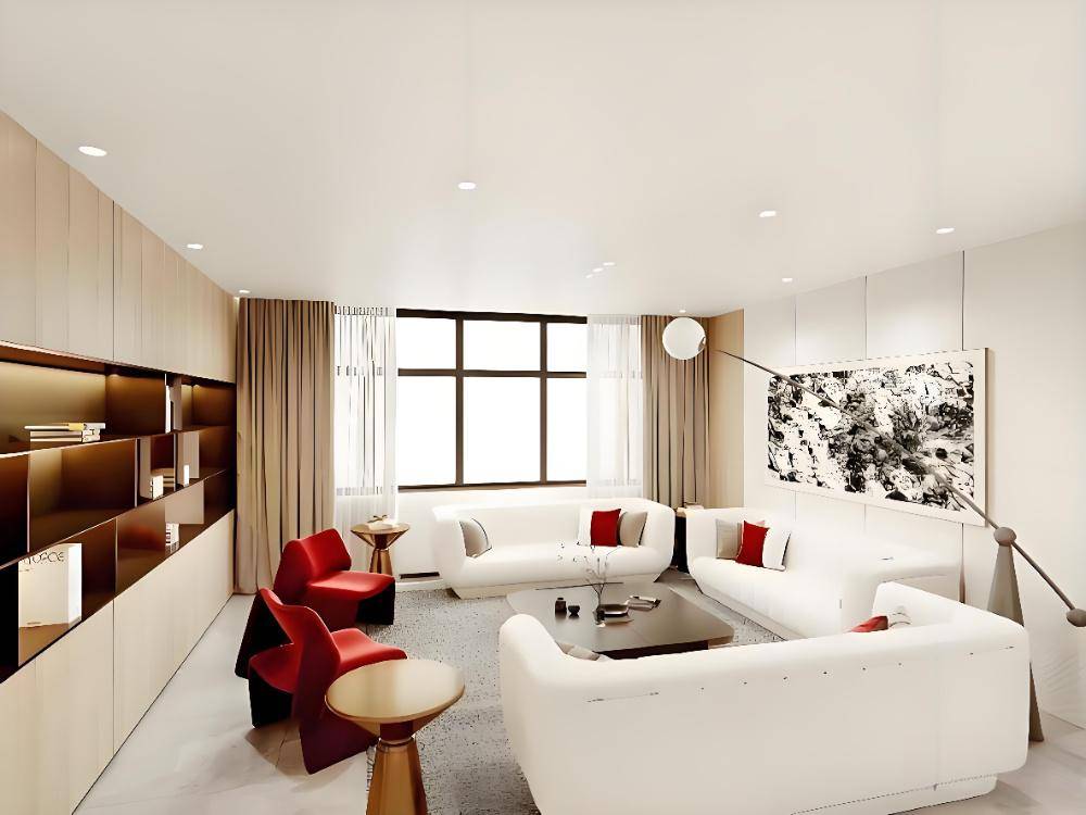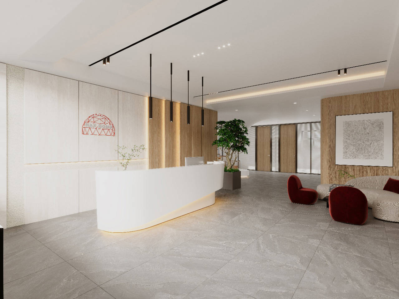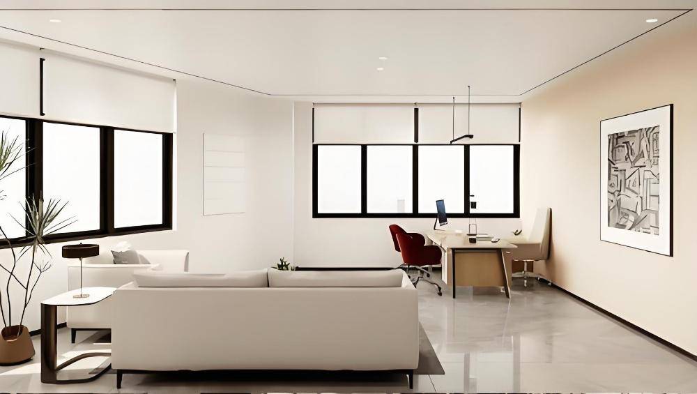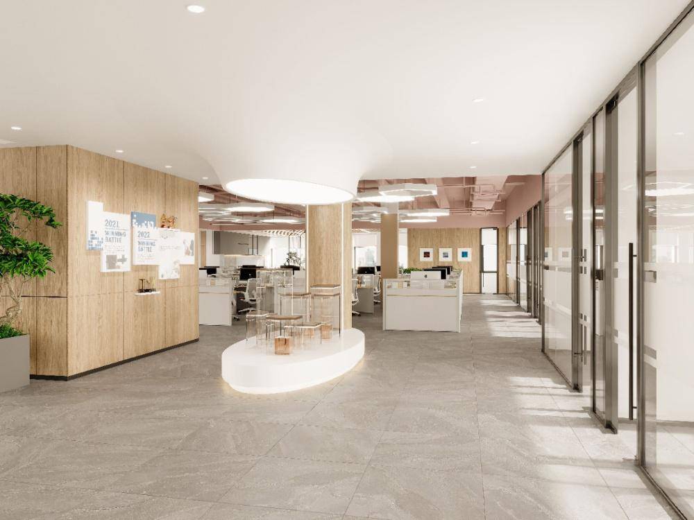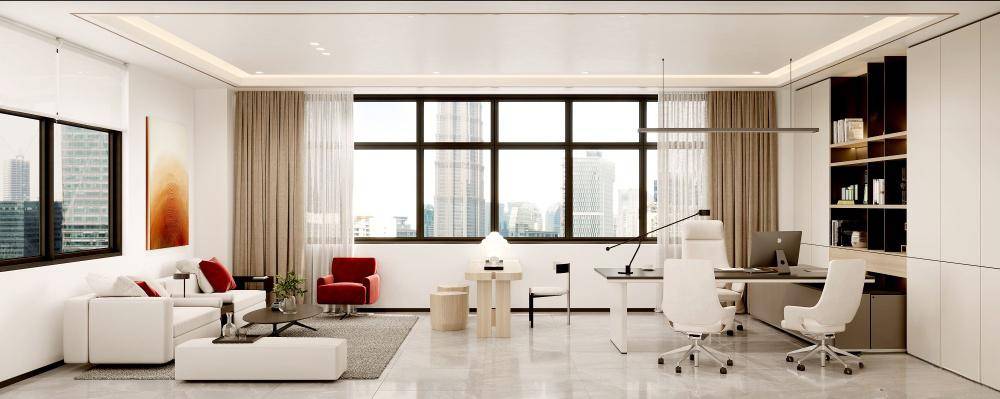 整个办公室以浅色为主,包括米色的墙壁、灰色的地面以及白色的天花板,营造出一种明亮且宽敞的氛围。木质元素的运用是本案例的一大亮点。