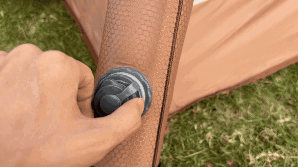 棕色部分是帐篷的四根气柱,其中三根上面都有放气口,而有一根气柱上面是充气泵,上面有一些提示,有一个带密封盖的TypeC接口和一个充气键,只要一摁就自动充气。一宿的充气泵运用的是aerogogo气泵技术,运行更高效和稳定。