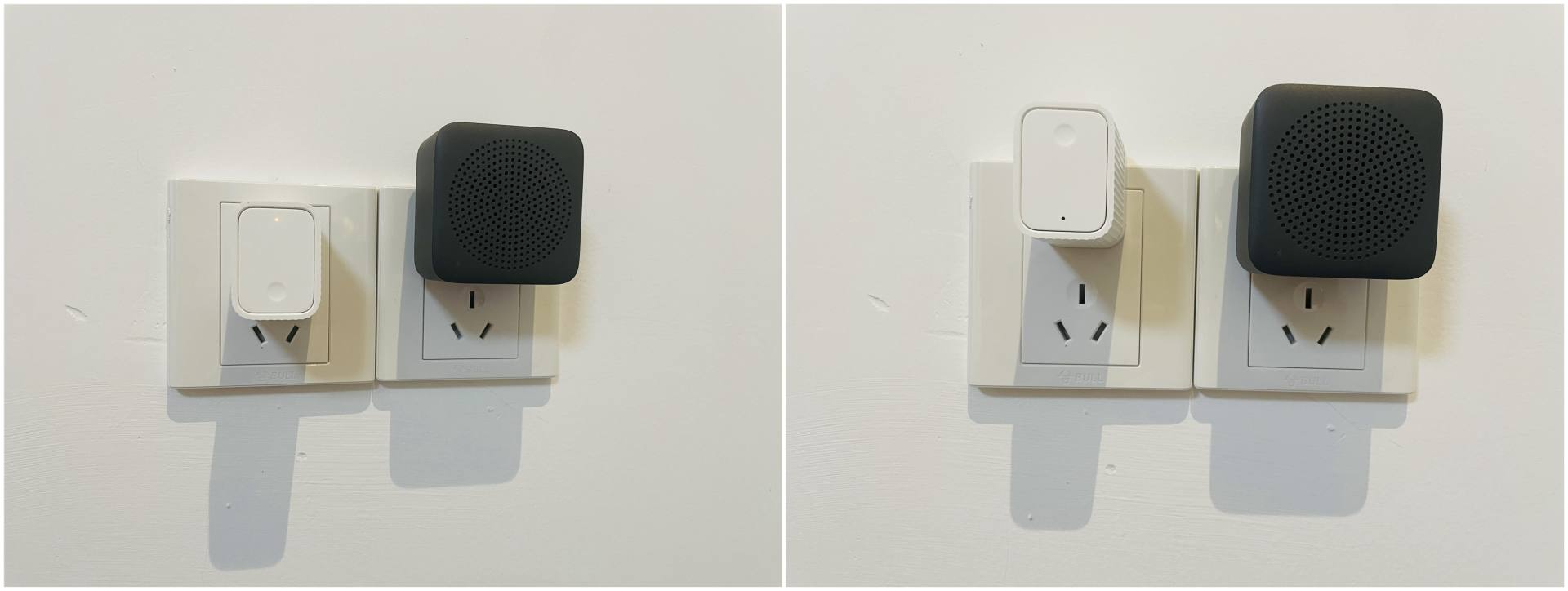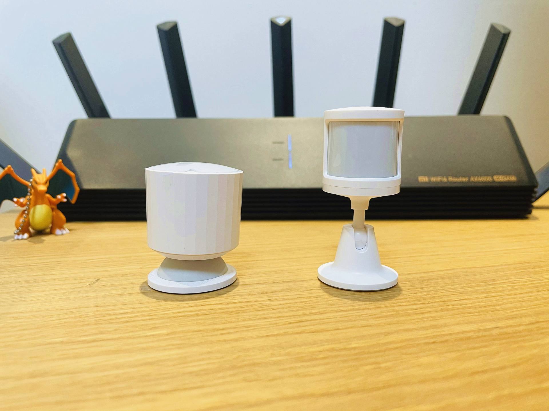 对比一下青萍动作和环境光传感器和米家人体传感器,放在一起来看两者的高矮胖瘦区分就很明显了,特别是当倾斜角度过大时,平面上未进行固定的情况下,米家人体传感器就无法保持稳定,青萍动作和环境光传感器基本不受影响