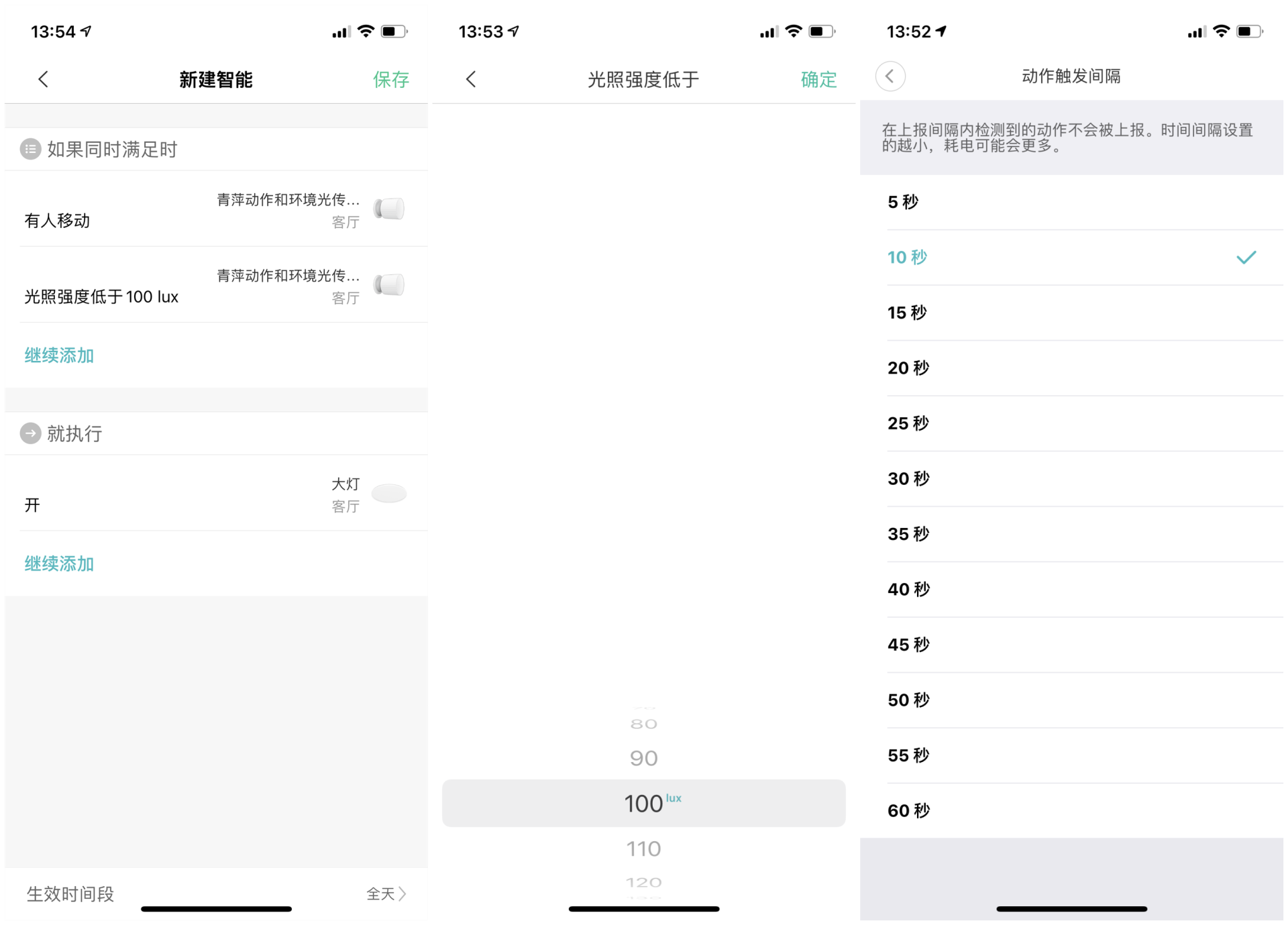 在智能场景设置中,可以对光照强度和触发时间进行设置,可以自定义光照强度,与最新的小米人体传感器2只能感知明暗相比,青萍光感灵敏度更高,意味着可玩性更高