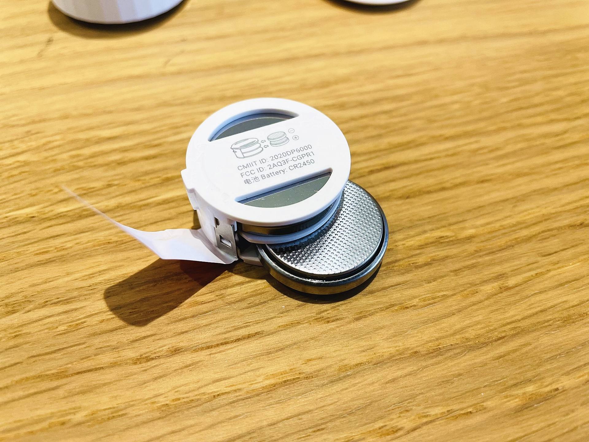 ▼传感器电池仓占据了内部很大的空间,按照图标提示并逆时针旋转卡口,拉动红色标签就能拉出电池仓,传感器采用了两枚CR2450纽扣电池供电,电池从侧部缺口轻轻推动就能取出来,电池的更换还是非常方便的
