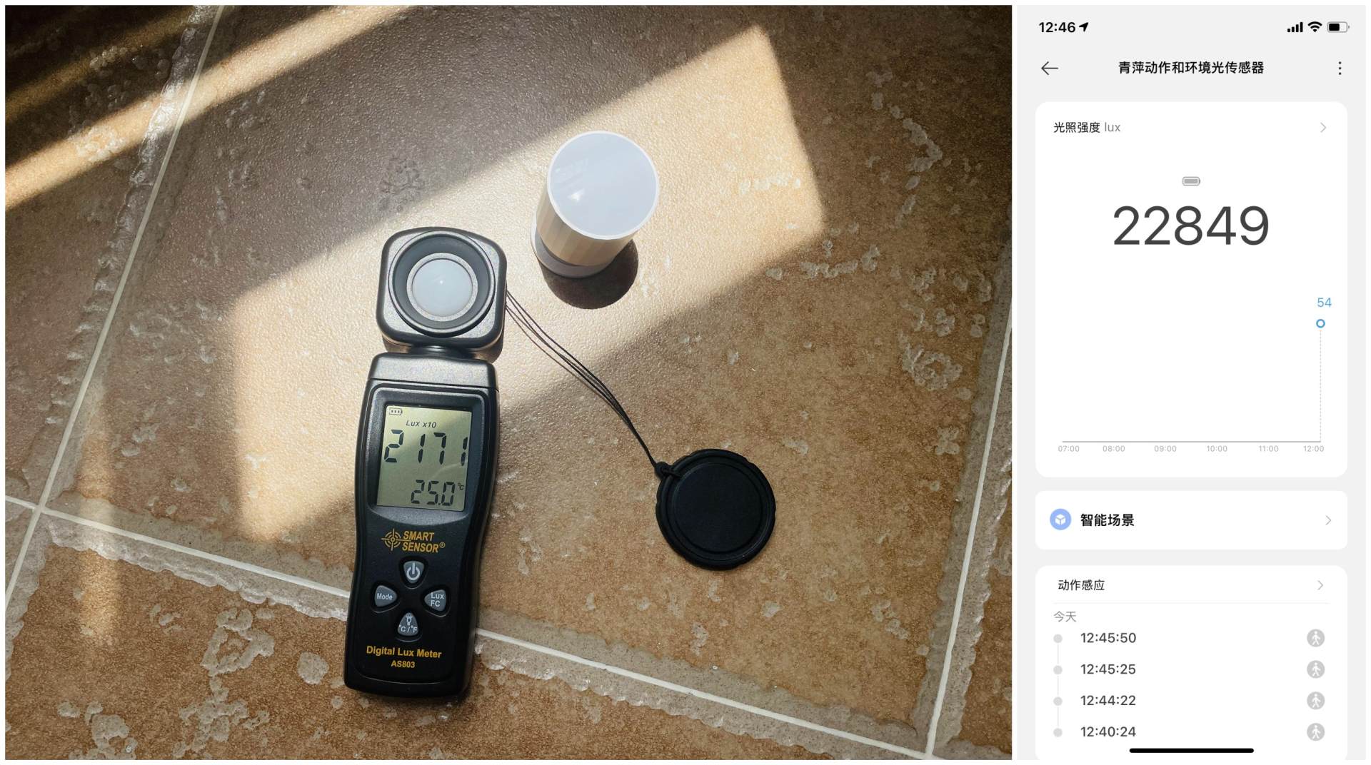 对青萍动作和环境光传感器的光传感器检测,可以发现数值还是比较存在一定的偏差,但基本上日常生活中完全够用:阳光下,照度仪检测值为21710,光传感器检测值为22849,较暗处,照度仪检测值为2979,光传感器检测值为2745