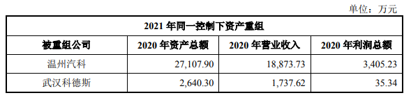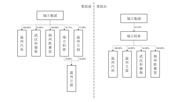 招股书显示,2021年,公司与控股股东瑞立集团签订协议受让其持有的温州汽科、武汉科德斯、扬州胜赛思的全部股权,以及与瑞立集团下属控股子公司温州立创签订协议受让其持有的温州立晨30%的股权,将上述主体纳入合并范围内。