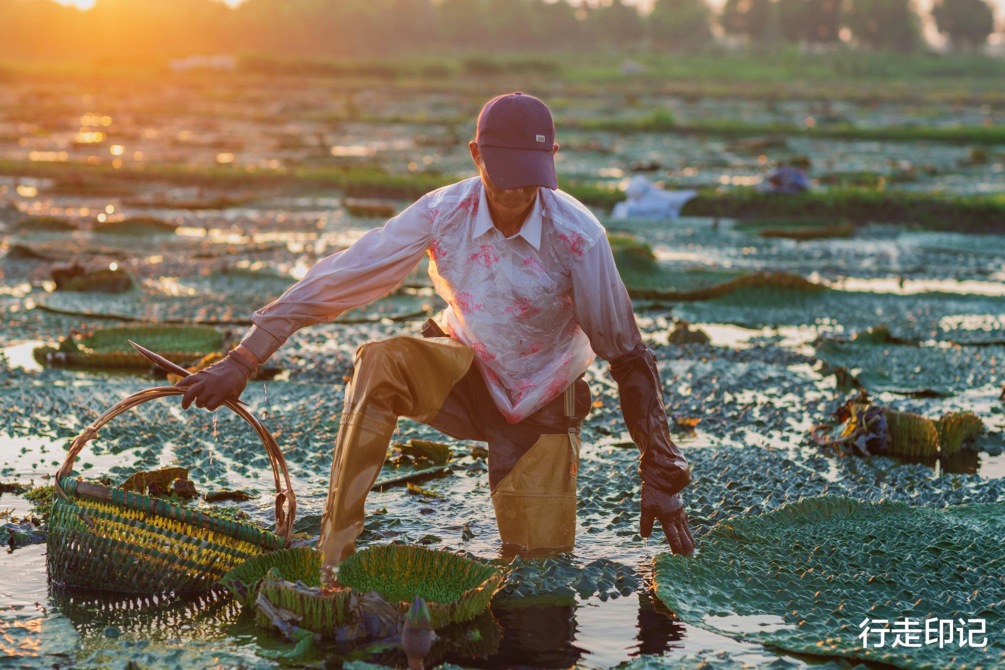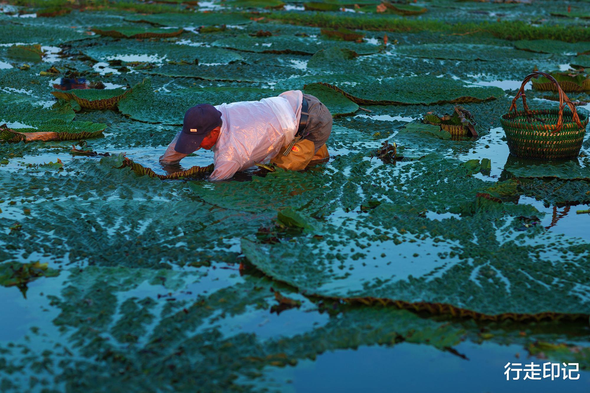 农民踩着泥水,深一脚浅一脚,趴下腰贴着水面,从带刺的叶下摸到拳头大小的果实,再用竹刀在根部快速划上两刀,一个状若鸡头的果实脱水而出。