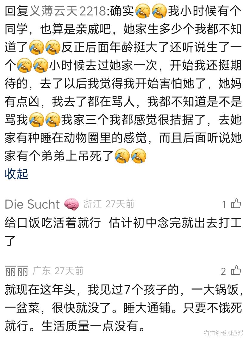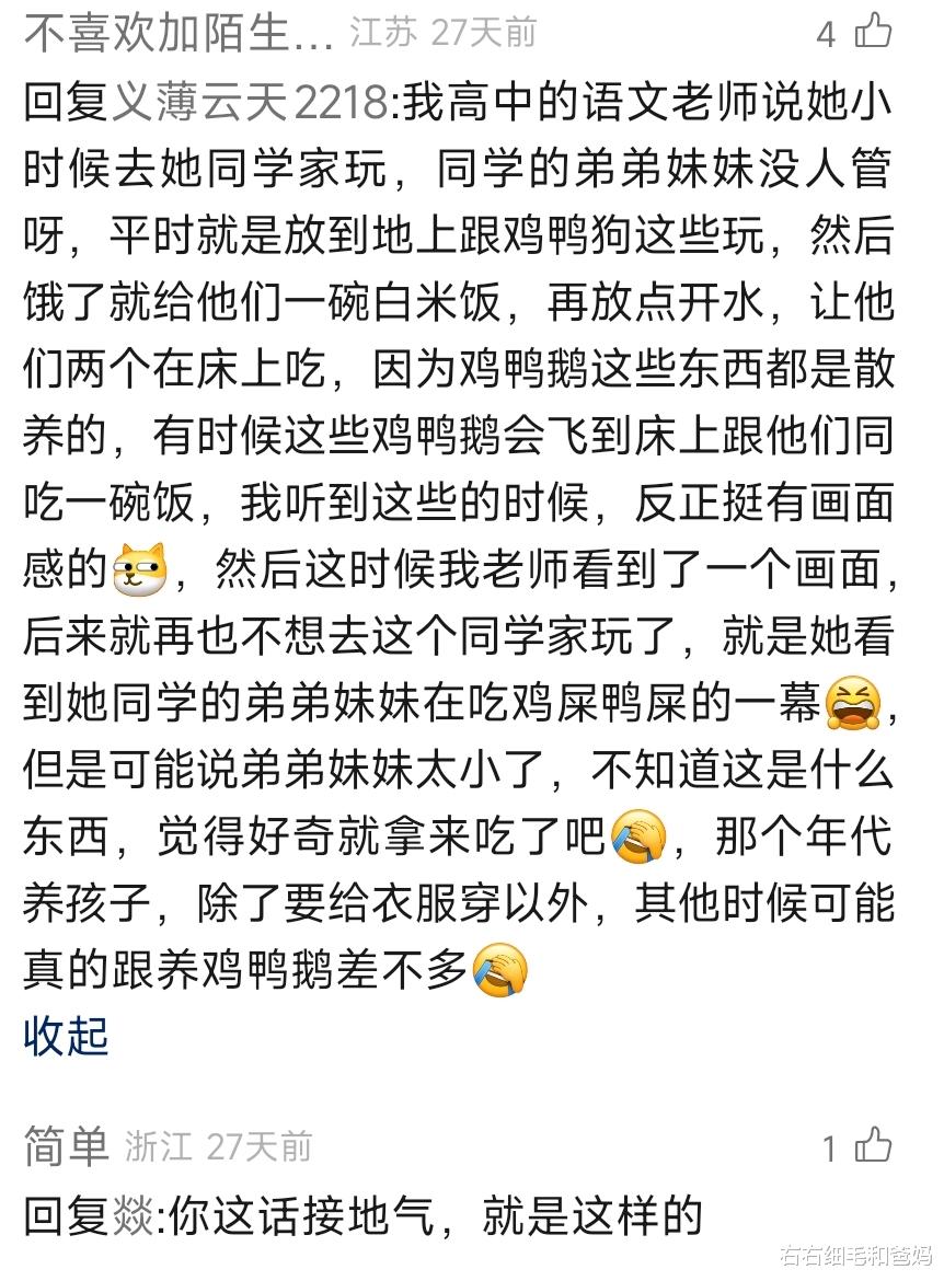 有网友坦言:“怎么养大,不就是鸡鸭鹅一样,没冻着饿着罢了,肯定没怎么读书,就出去打工了。”