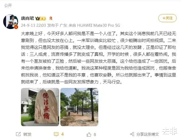 大家晚上好,今天很多人问我是不是一个人住了。其实这个消息我前几天已经无意刷到,但也没太放在心上。一来军训确实比较忙,很少能腾出时间拍视频。二来我觉得这只是网友的恶搞,就没太理会。但经过这几天的发酵,正是印证了那句话:三人成虎,流言传播多了就变成了真相。开学的时候,很多人都在看热闹。我有一个室友被拍到了正脸,然后被一些网友放大恶搞。这个给他造成了一定的困扰。后来他申请换宿舍,我给他道歉。我说这某种程度是因为我给他造成的困扰,他搬宿舍前找我的时候,他知道这不是我的本意,他喜欢安静。所以他就搬出来了。事情到这里就结束了,后续就是网友发挥想象力,天马行空。