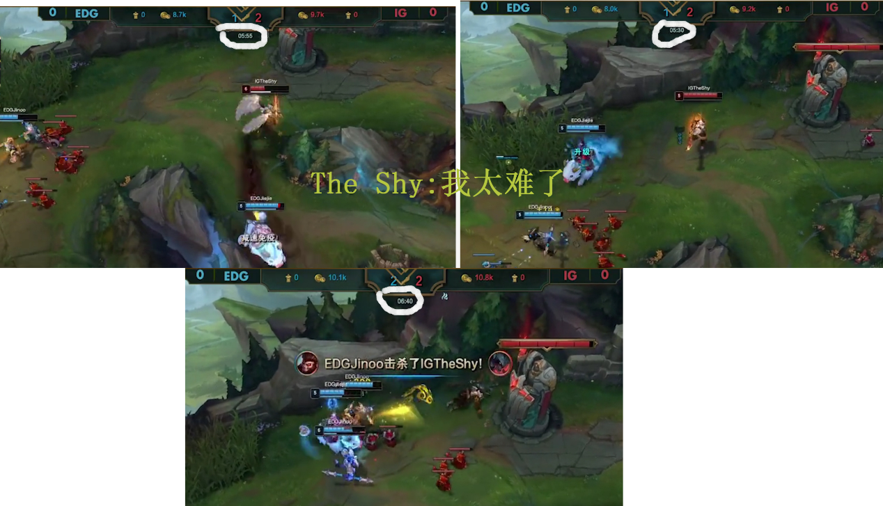 在这次比赛中,从5分30秒到7分钟仅仅不到两分钟的时间里,EDG的打野Jiejie玩的猪妹连续来抓了Shy哥三次,还不惜买了三个真眼。但即使是猪妹配猴子这样的连环控,前两次Shy哥还是逃脱了甚至还凶了Jiejie一套;而在第三次时双招双大招配合越塔才勉强抓死一次TheShy,可谓十分艰难。而Shy哥在此时也是无奈地露出了苦笑——我就玩个剑魔何必这么针对!那么为什么Shy哥的剑魔如此具有威胁力呢?