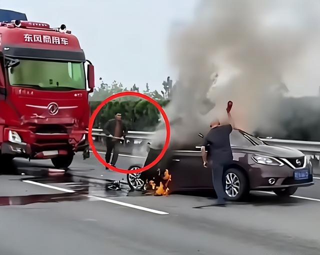 刚开始,小轿车的火势还没有这么严重,这位大哥看到轿车起火,担心车里有人被困,二话不说,拿起手边的工具就冲了上去。