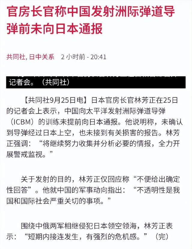 “非常担忧”、“全力开展警戒监视”、“中国缺乏透明度”……,日本政府仿佛受到了莫大的刺激,接连抛出一系列措辞强硬的声明,仿佛中国这次试射是针对日本而来。日本内阁官房长官林芳正甚至公开抱怨中国没有提前向日本通报,全然不顾中国外交部发言人“此次试射不针对任何特定国家和目标”的明确表态。