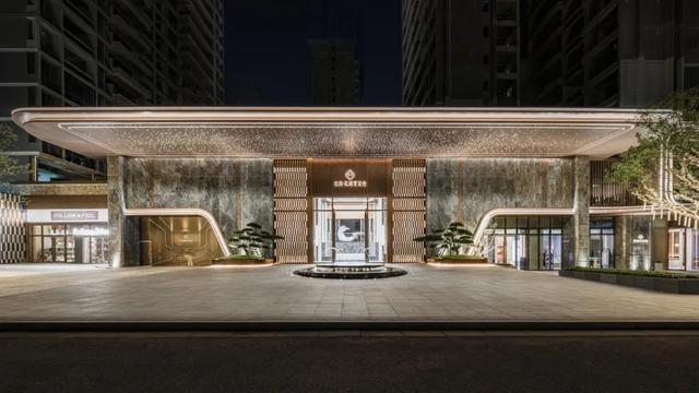 整个项目的配置相当高,达到2万+高端的标准。例如,大门造价高昂,采用轻奢酒店式入口设计,高度达到了11m,配合稳重的玫瑰金和礼堂级的星空顶设计,高级感+度假风同时拉满。